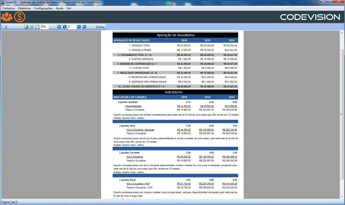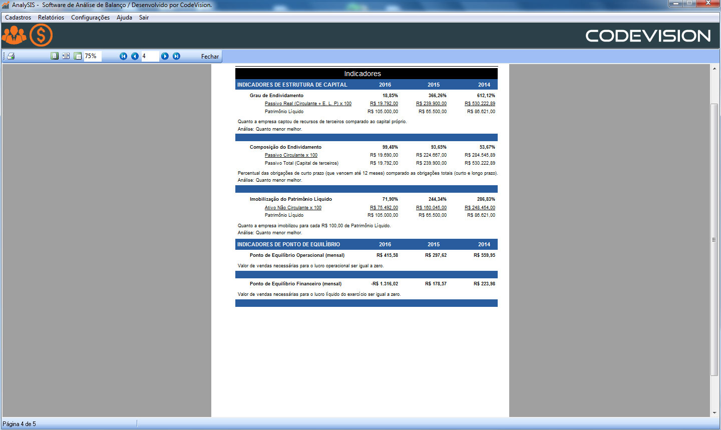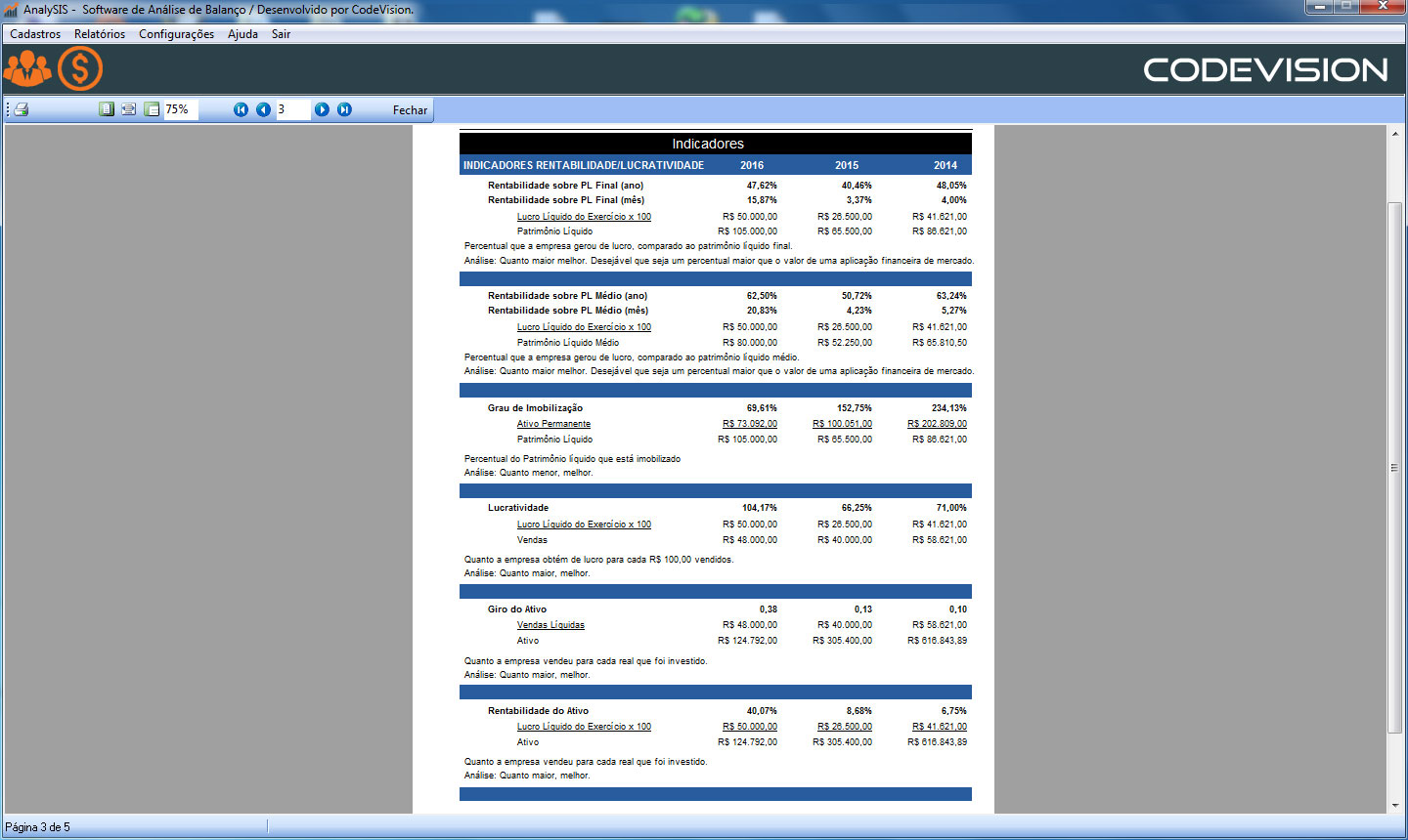 ANALYSIS permite visualização sistêmica e resumida da apuração de resultados e do balanço patrimonial, bem como indicadores, comparando a evolução ano a ano, além de demonstrações gráficas e cálculo do ponto de equilíbrio.