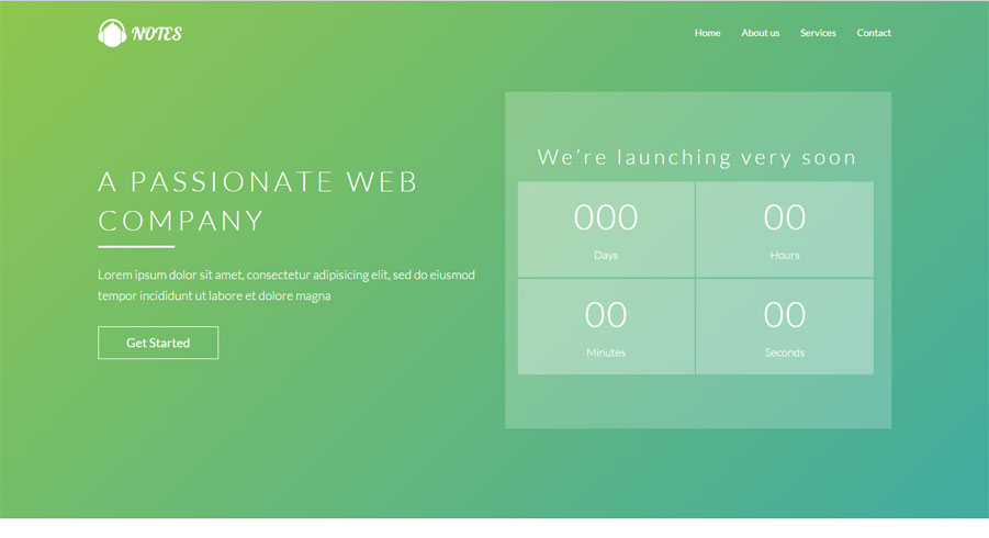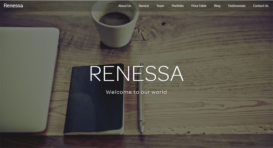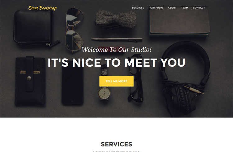Página criativa, com imagem grande e menu superior.